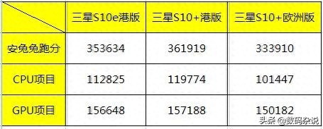安兔兔跑分方面,骁龙855版的三星S10e跑分成绩为353634分,其中CPU成绩有112825,而GPU成绩则有156648。而骁龙855版的三星S10+,总分成绩则为361919,其中CPU成绩为119774,GPU成绩157188分,两项分数都相比S10e略高一点。
