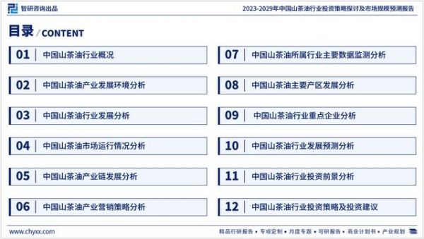 《2025-2029年中国山茶油行业投资策略探讨及市场规模预测报告》是智研咨询重要成果,是智研咨询引领行业变革、寄情行业、践行使命的有力体现,更是山茶油领域从业者把脉行业不可或缺的重要工具。智研咨询已经形成一套完整、立体的智库体系,多年来服务政府、企业、金融机构等,提供科技、咨询、教育、生态、资本等服务。