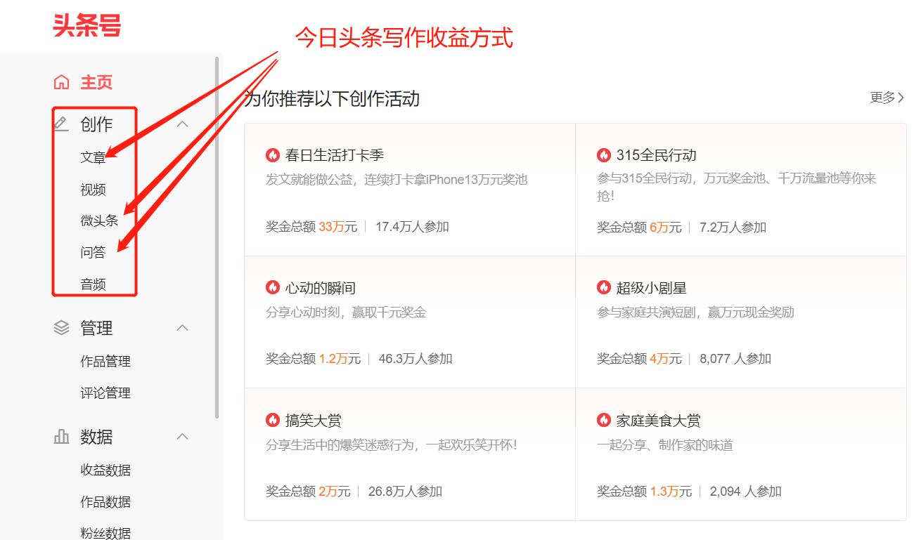 此外今日头条适合0基础小白写作赚钱的方式有写文章、写微头条、写问答、写小说等。
