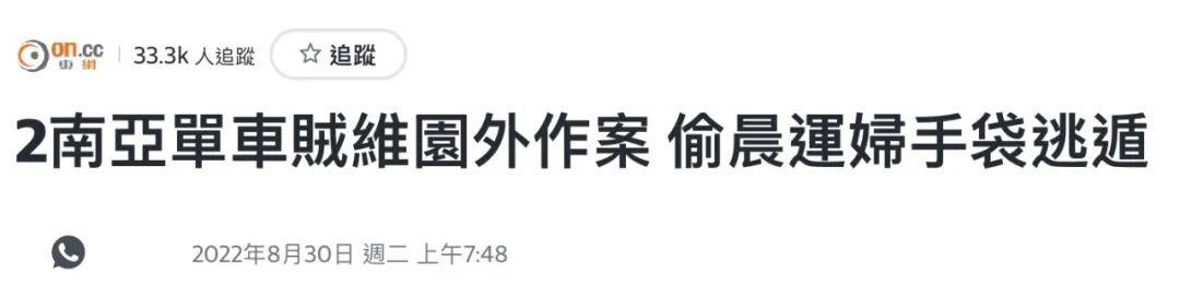 8月30日再现南亚单车贼偷晨运妇手袋。事发于铜锣湾维多利亚公园,一名年约70岁老妇在晨运期间,两名南亚裔男子突乘单车经过,其后老妇惊觉摆放一旁的手袋不翼而飞,怀疑已成该南亚双贼囊中物,无奈报警。