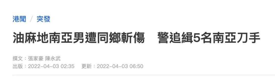4月3日凌晨1时许,油麻地南亚男遭同乡斩伤,警方追击4至5名约20至30岁南亚裔男子,事发时持刀。