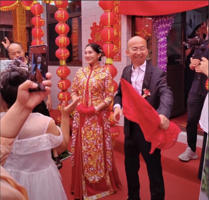 而娶了这样一位美人巨兴茂看起来也十分开心,拉着妻子的手笑容满面,到处招呼亲朋好友,大家也对这对新人拍照、欢呼,互相敬酒,婚礼现场热闹非凡。