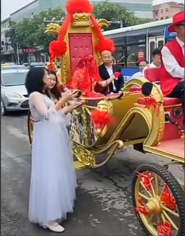 而他们路途中并不是坐豪车,而是乘坐颇有韵味的、精心定制的、用金子和红绣球装饰的婚车,还安排了十排手持花扇的舞者,整条马路都是他婚礼的主场,轰轰烈烈的,不得不说这场面非常隆重盛大。