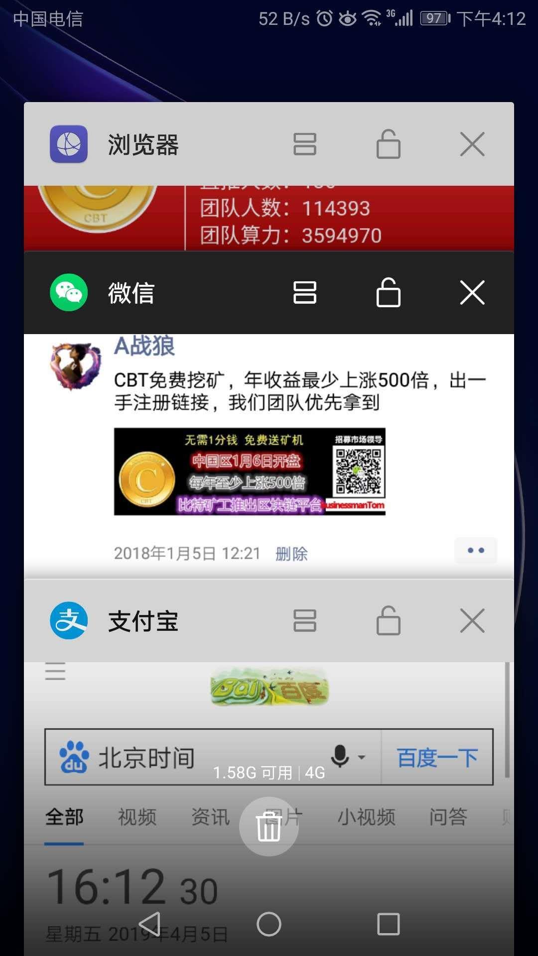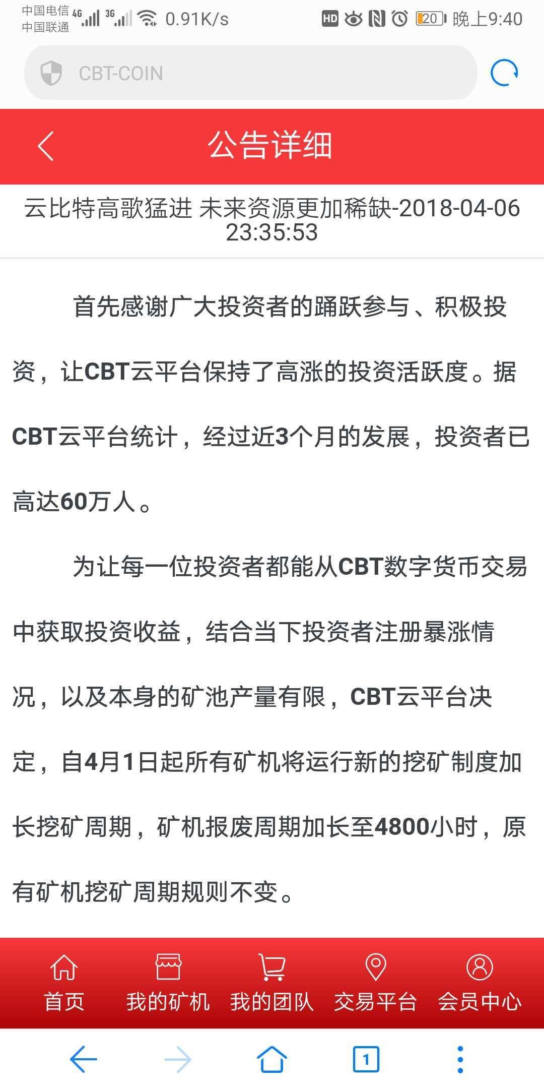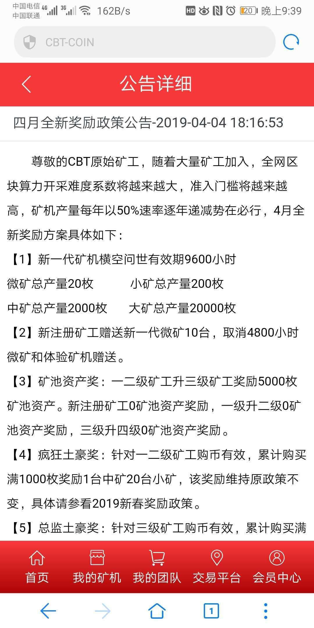 CBT每次升级和调整都是为了后续更加稳定可持续性发展,平台总是未雨绸缪,在2018年4月首次减产,从矿机720小时到4800小时,稳定运行一年多在2019年4月第二次减产,从矿机4800小时到9600小时,往事总是记忆深刻,小编是第一批玩CBT的玩家,那个时候还没开始注册,我就组建了各大微信群,开始推广,现在每分钟团队约增加三人左右,平台控盘很严谨,小编团队目前有十几万人,通过后台大数据分析,平台按照目前稳定持续发展将持续到2020年4月,更多详情请关注我们,以下是相关截图,请查看