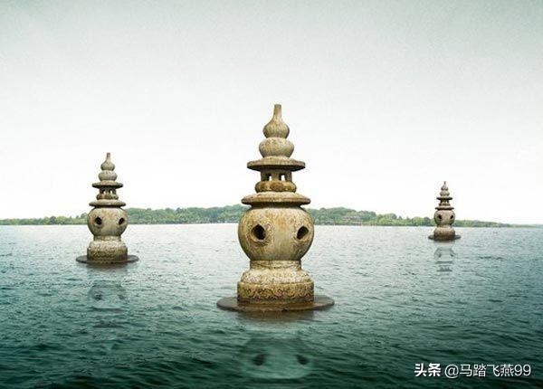 三潭印月为中国杭州西湖十景之一,是西湖中较大一个岛,面积6万平方米,又称为小瀛洲。岛南湖上有三座石塔,塔高2.5米,露出水面2米,由基座、圆形塔身、宝盖、六边小亭、葫芦顶组成,塔身球形中空,周身开有五个小圆孔,孔边饰浮雕花纹。