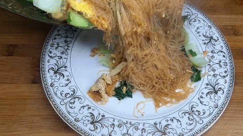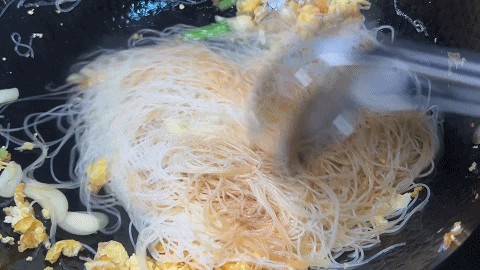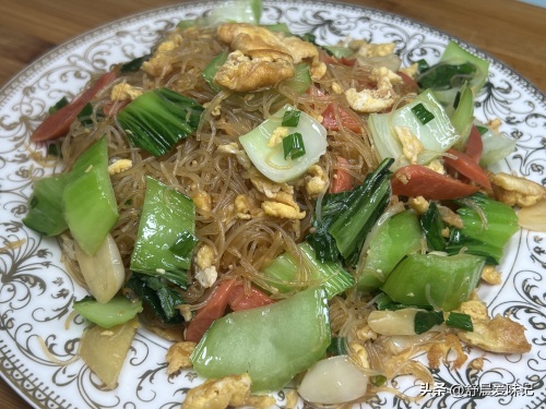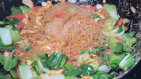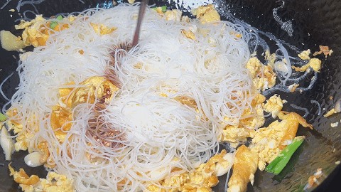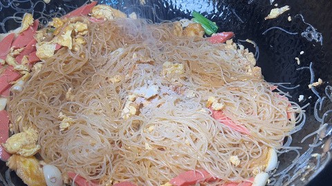 路边摊的炒米粉做法来啦,加小青菜和火腿肠,看着都有食欲,好吃