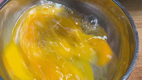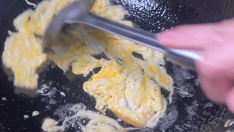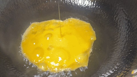 3、 用铁锅炒锅气十足,油热倒入鸡蛋液,炒成鸡蛋碎