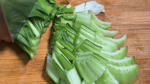 10. 小青菜洗净切成宽条,切好之后放入盘中备用