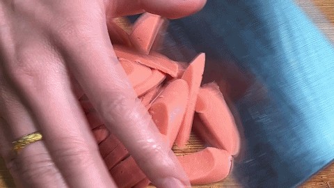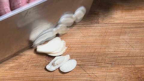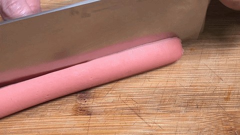 5. 火腿肠一根剥去外皮,然后从中间切开,再斜刀切成薄片
