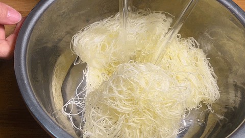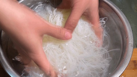 2、 控干水分的米粉加入植物油,用筷子拌匀,这样炒的时候不坨不粘连