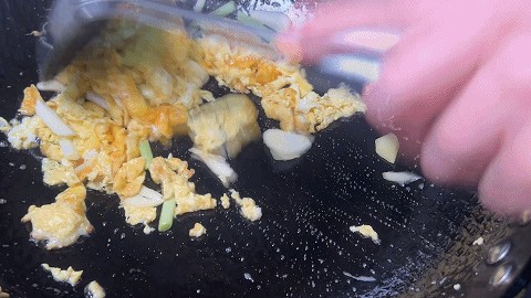 12. 倒入鸡蛋液,用勺子炒成鸡蛋碎