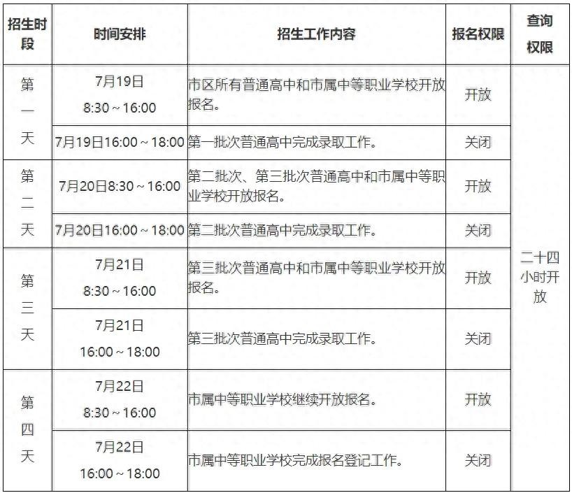 2024年市区高中阶段学校统一招生工作在7月19日至22日进行。其中,市区普通高中招生在7月19日至21日三日内进行,在录取时间内各校的指令性(含定向生和非定向生)和指导性招生计划同时完成。中等职业学校招生工作与普通高中招生工作同步开始,7月22日完成网上报名登记工作。