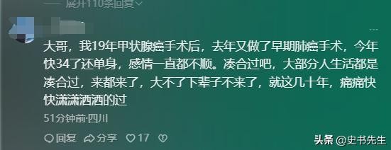 其中就有一位网友声称自己在去年的时候就做了肺癌手术,如今已经34岁了可身边还没有爱人,感情上更是屡次受挫。