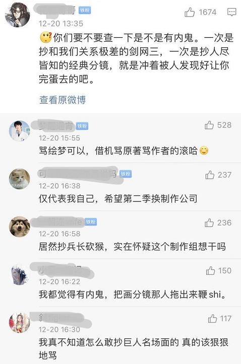 不过,最让人不解的是制作方的态度。抄袭可耻,但抄袭后默不发声的行为更让漫迷震惊,《巨人》动画制作方目前未给出任何表示,很多漫迷却看不下去了,第一时间去《天官赐福》动画制作方绘梦公司官博下面声讨,很多前排微博下面都有网友为了这件事发声。