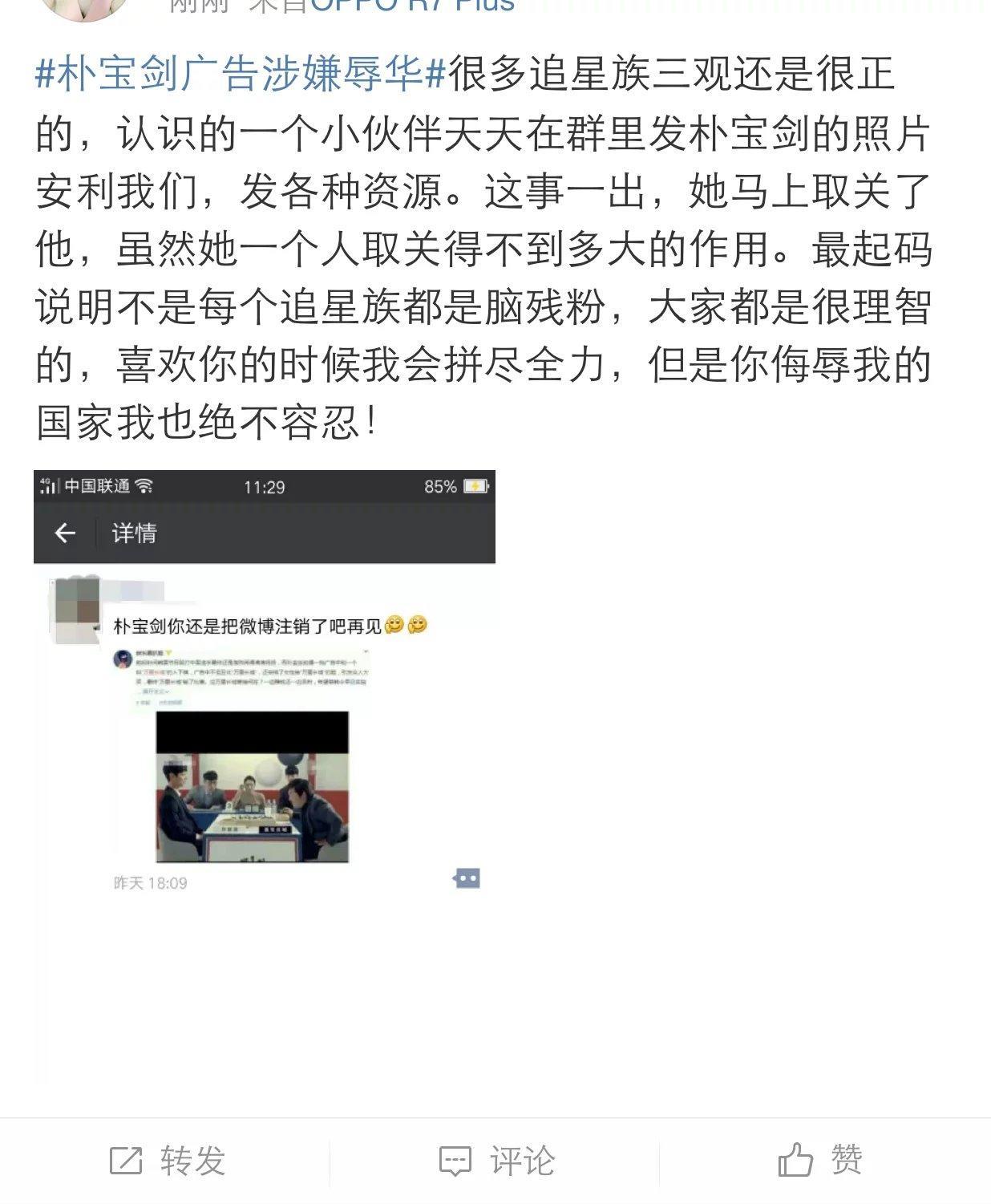 朴宝剑广告辱华 迷妹集体转黑