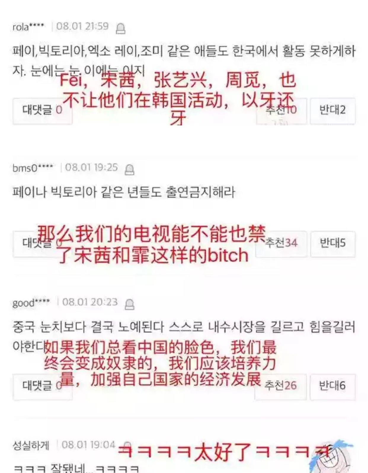 总之千万个错误都是你,我们宝剑没有任何!错!哎呀,总之就是我家爱豆超级无辜!我家爱豆很单纯!!你们这些刁民呐!你不要总害我偶吧啊!!韩国网友们更是义愤填膺,群情激愤。甚至表示,要以牙还牙,禁止中国艺人在韩国活动。