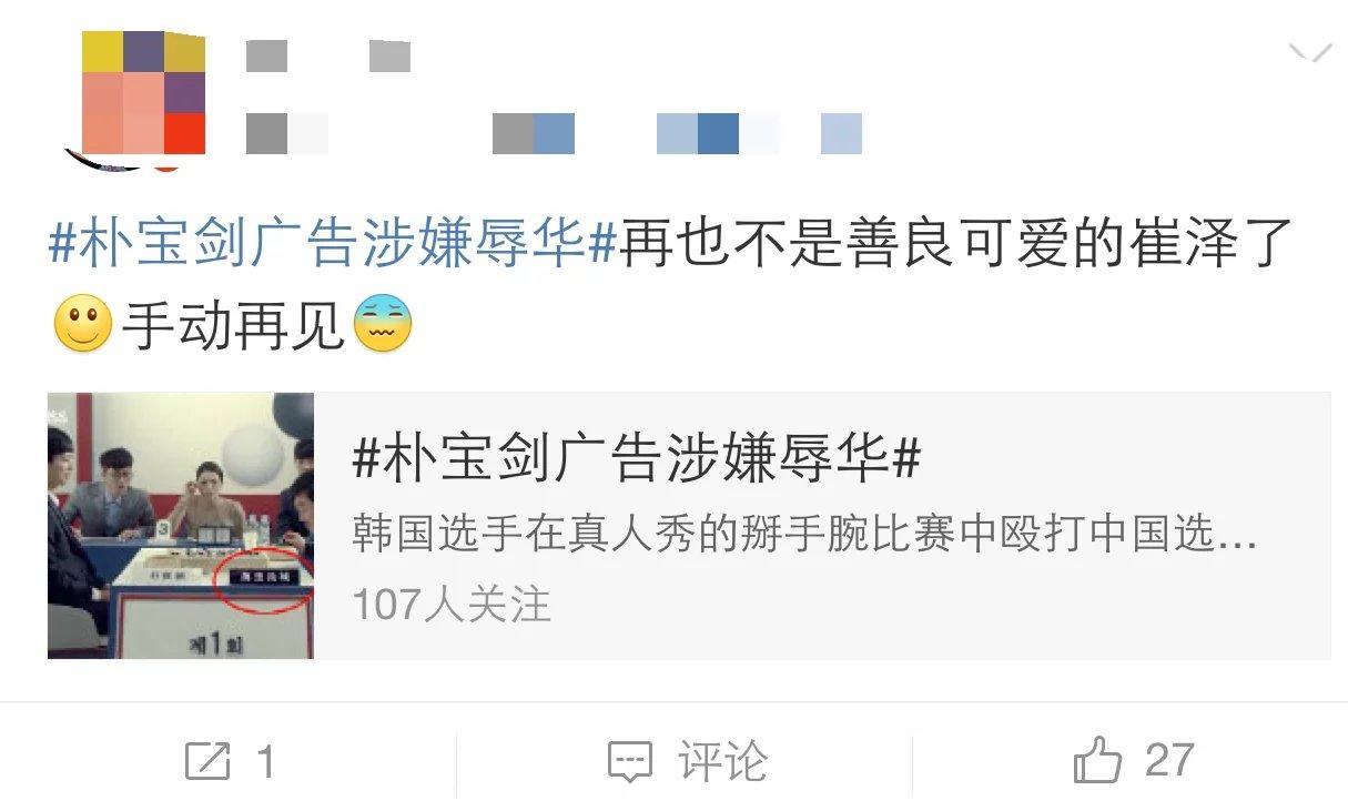 朴宝剑借着自己剧中出色的演出,在剧外延续崔泽的热度和人设,拍摄这则广告。但是,将对手取名为“万里长城”!!请问, 全世界还有第二个万里长城吗?这个指代性非常明显!这不就是对我们中国和我们中国人的侮辱吗???看一眼该品牌的官博,并没有对此事进行道歉和解释。而仅仅是…