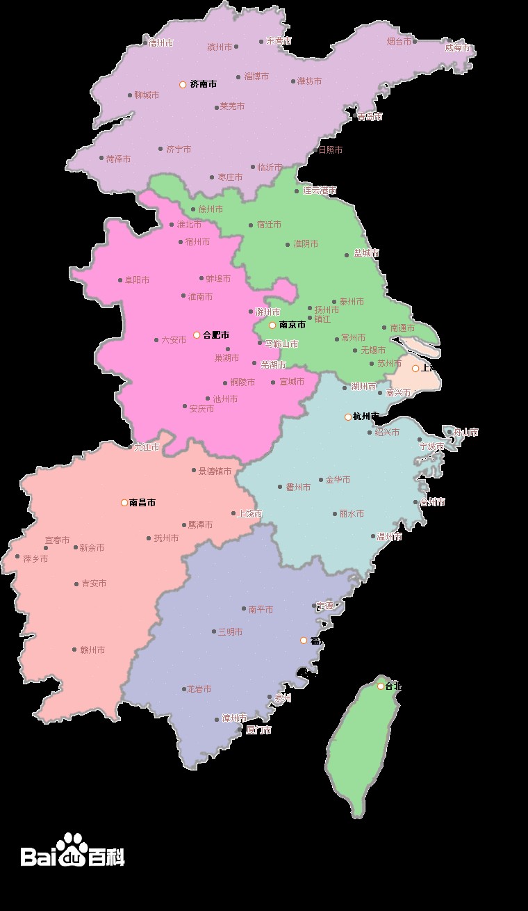 标题说明:华东,位于中国东部,建国初期,华东区曾为中国六大行政区之一,如今华东仍被用作地区用名,包含上海、江苏、浙江、安徽、福建、江西、山东、台湾,七省一市,台湾因特殊性,不在此次标题华东的范围内,故称“六省一市”。