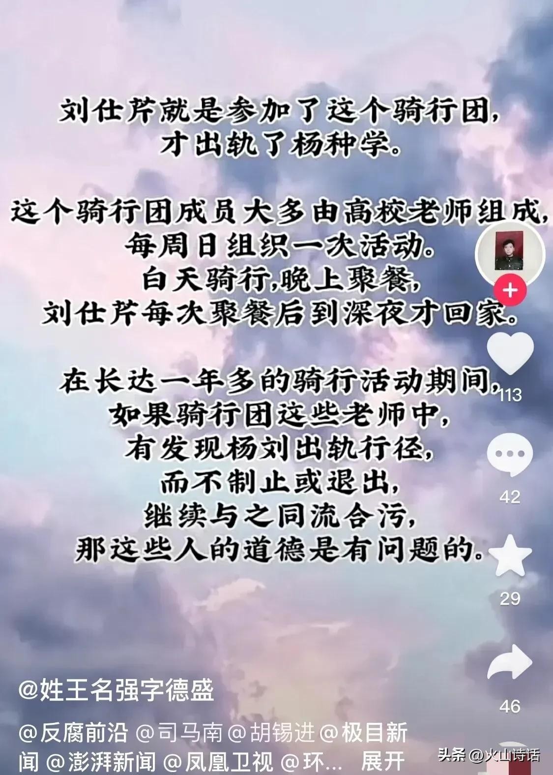 此外,这起事件还引发了网友们的热议和吐槽。有人表示,杨书记和张女士的行为是对婚姻和道德的背叛,应该受到法律和舆论的惩罚。有人表示,王先生是一个可怜的受害者,希望他能够振作起来,重新开始新的生活。有人表示,骑行团是一个危险的地方,不要轻易参与,以免陷入不良的人际关系。也有人表示,这件事情反映了高校领导干部的作风问题,需要加强监督和管理,提高廉政意识和道德水准。