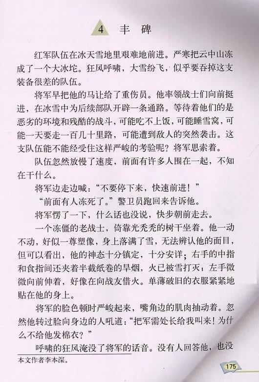 《丰碑》则是过雪山时,一位身为军需处长的老人,把棉衣让给战士,自己却永远留在了白雪皑皑的雪山上。