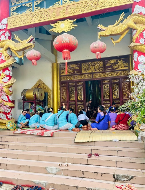 相较于洞景佛寺的清冷,下城大佛寺就显得很热闹了。正巧碰上傣族和佤族妇女的祈福现场,大家都身着民族服装,很是虔诚。两座佛寺虽同为南传佛寺,感官上却大有不同,民族宗教文化信仰确实值得认识和研究。