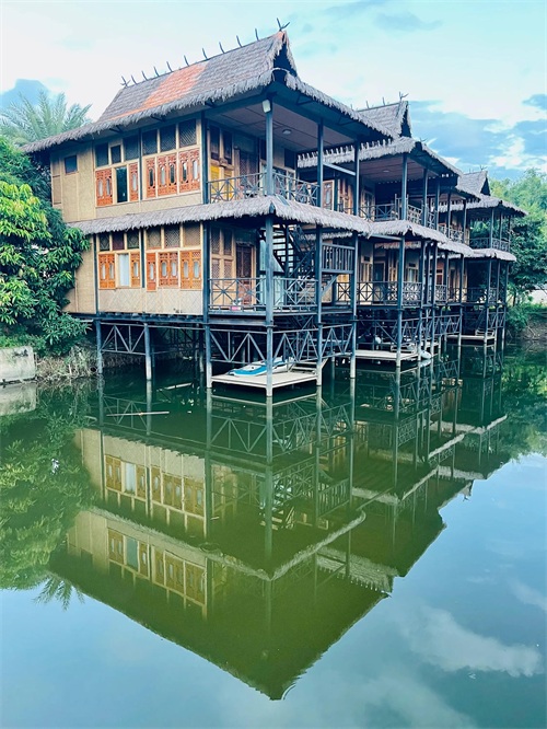 南汀画院现在开放为客栈,平时也会作为艺术生写生基地,还没有完全装修好。整个园区都是傣族风格建筑,我们住在水上小楼的下层,可以直接下到水边,旁边就是连接两岸的吊桥,早晚在园区里随意走走,拍照极出片。