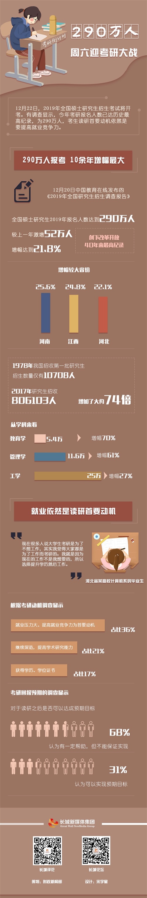 12月22日,2019年全国硕士研究生招生考试将开考。有调查显示,今年考研报名人数达历史最高纪录,为290万人,考生读研首要动机依然是希望提高就业竞争力。