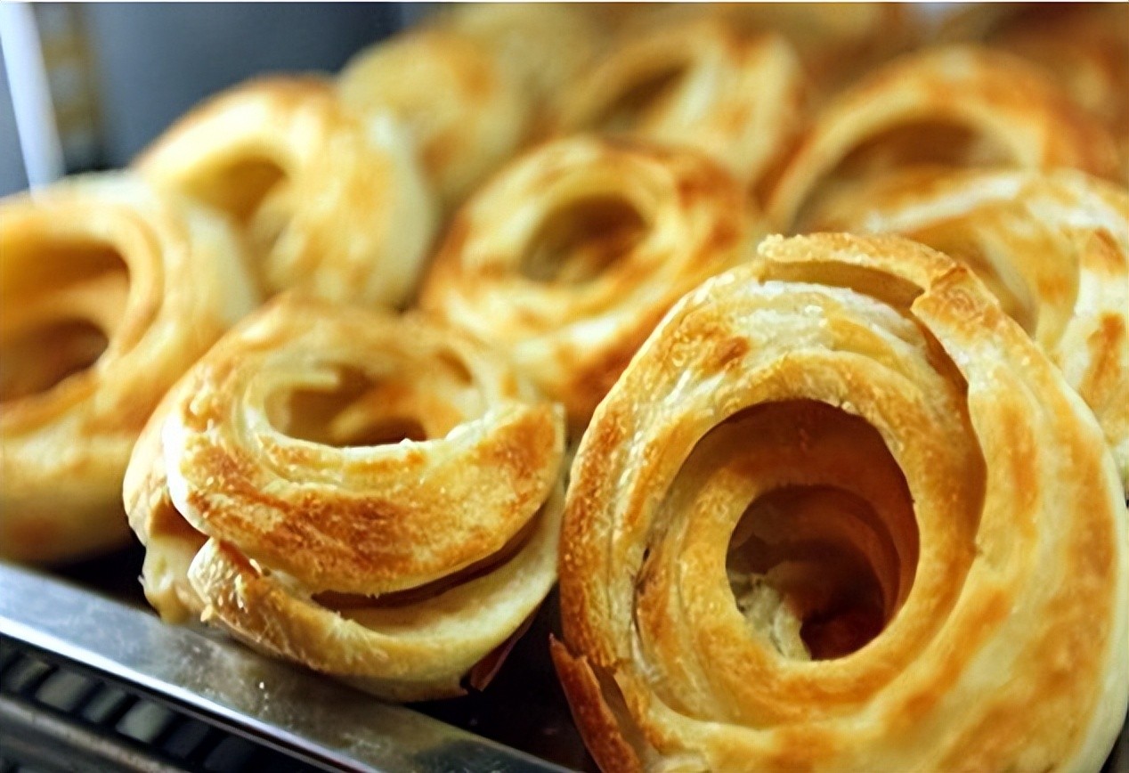 3:济南油旋:这是一种面食,外皮酥脆,内馅软糯。油旋的形状为螺旋状,象征着济南“泉城”的泉水旋转上升之势。