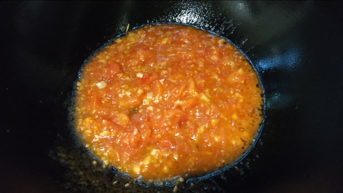 起锅烧油,加入葱,姜,蒜末,泡椒碎炒出香味,然后加入西红柿碎继续翻炒,炒出西红柿汁水,