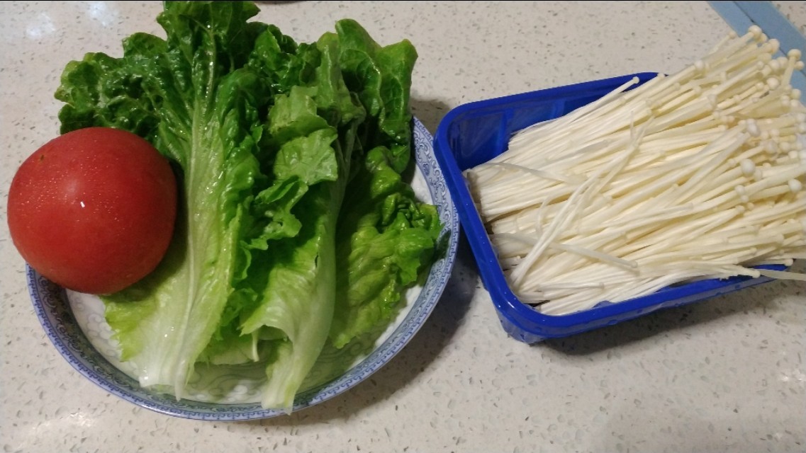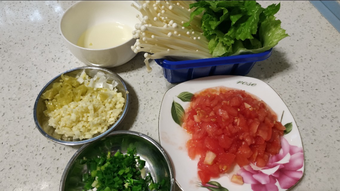 首先把金针菇根部去掉,西红柿,生菜,香菜,葱姜蒜洗净控干水分,然后,西红柿切碎,生菜切段,葱,姜,蒜切沫,小香葱切末,泡椒切碎备用。