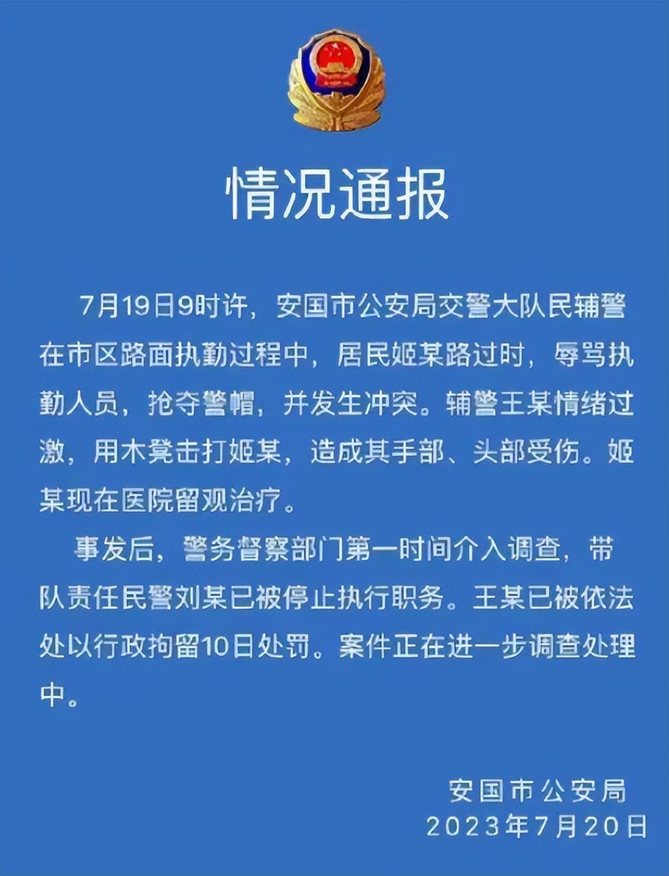 7月20日,河北警方发布了通告,称是老人先辱骂执勤人员,这才有了接下来的冲突,打人的交警也已经被拘留了。