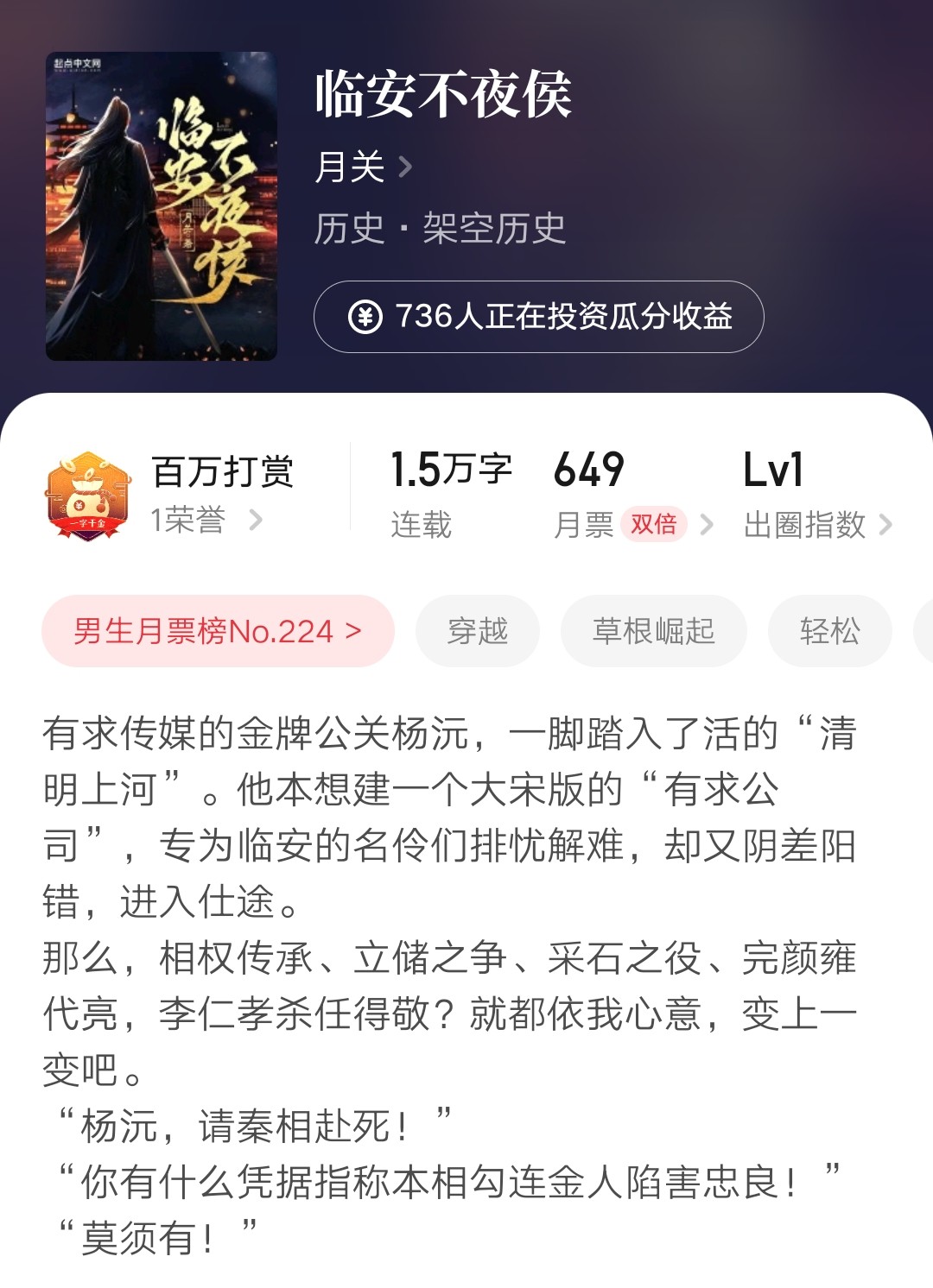 历史大神月关回归起点,新书《临安不夜侯》已经在元旦正式开始更新了。
