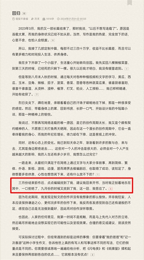 早在去年三月,其发在番茄的《莫若凌霄》写得差不多的时候,起点这边就已经有编辑联系他,建议回来开书了。只是当时他正想着封笔休息,正在享受种田生活,也就拒绝了。