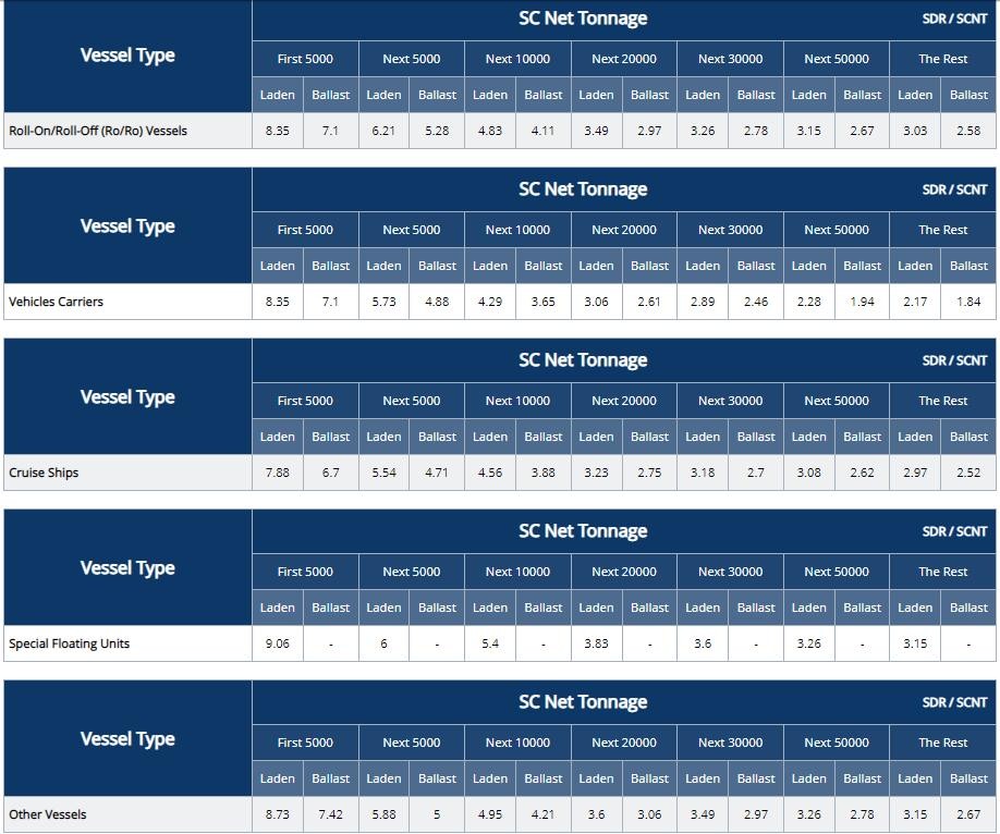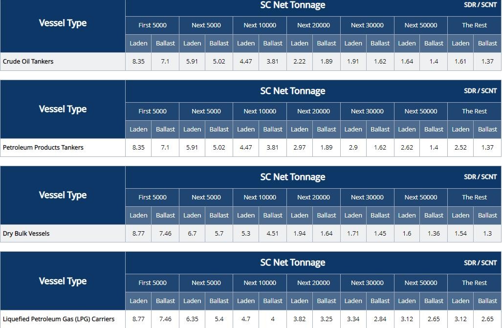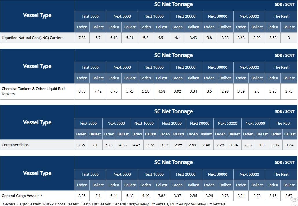苏伊士运河船舶费率表