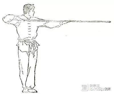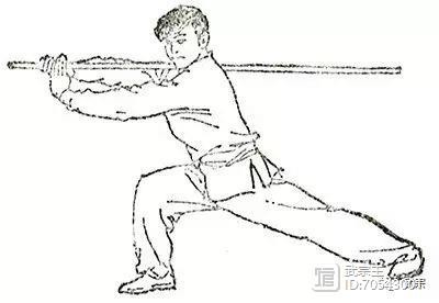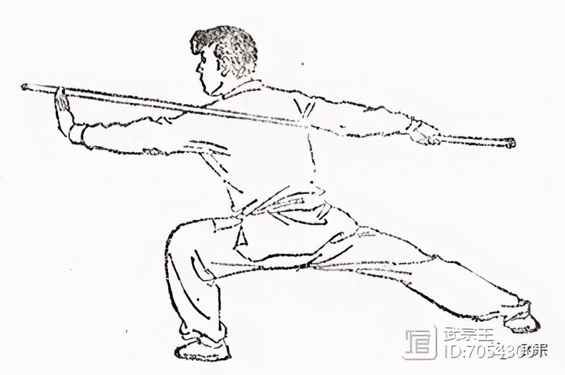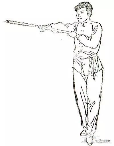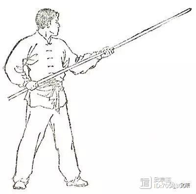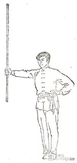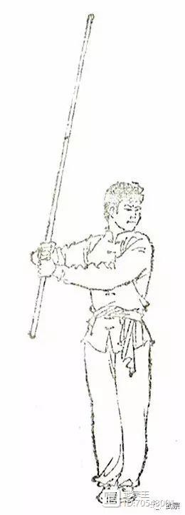 两手握棍,一手在前,另一手屈肘于腋窝前,将棍身夹于腋下;棍端不得摇摆(图130)。