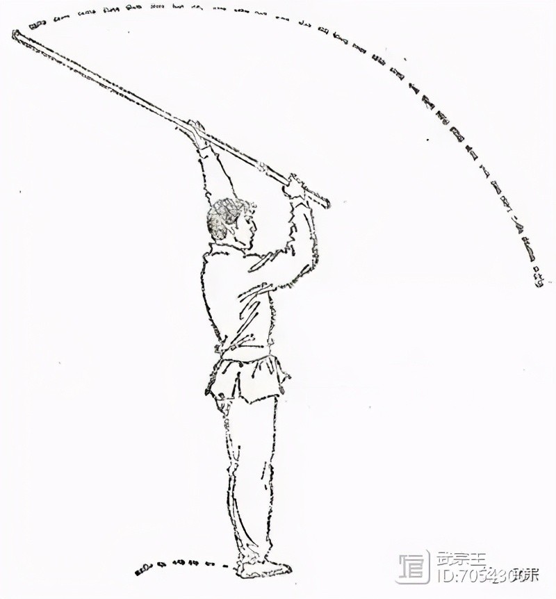 两手满把握于棍身后段,双臂举起于头后上方,棍斜朝后上方,为后举棍(图127)。