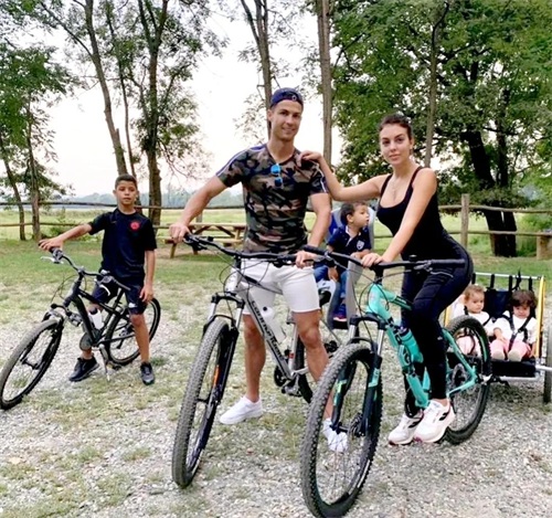C罗带着孩子、女友骑单车锻炼身体,两个小宝宝坐在后面,超级可爱。