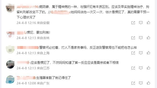 是光处罚就能解决问题的,多次了,要去看心理医生了,像这种一次又一次的,他妈只有被气死的份儿,哪怕揍死他他也改不了,必须上措施强制,每次打哪里行,去看一下心理医生叭!