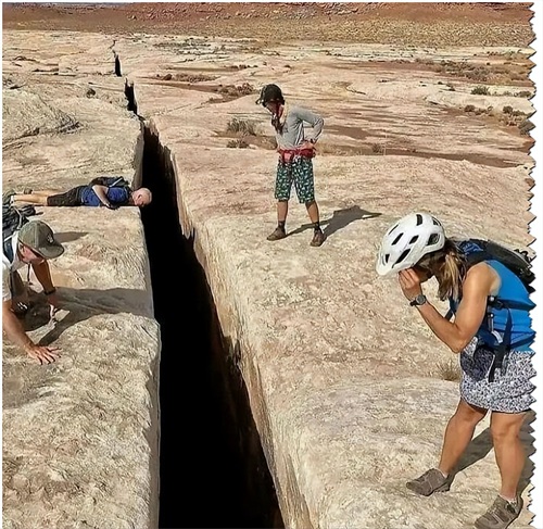 17.在犹他州峡谷地国家公园的小径旁,一条深达65英尺的黑色裂缝蜿蜒伸展。