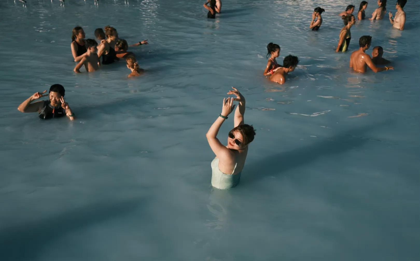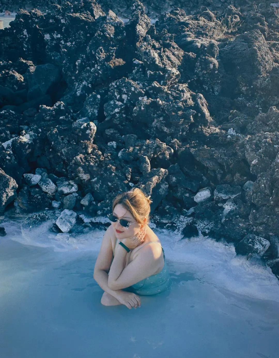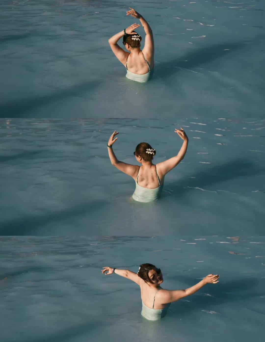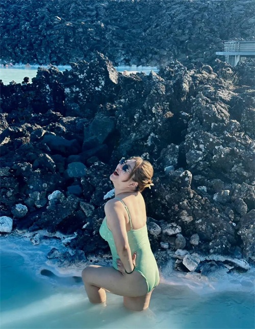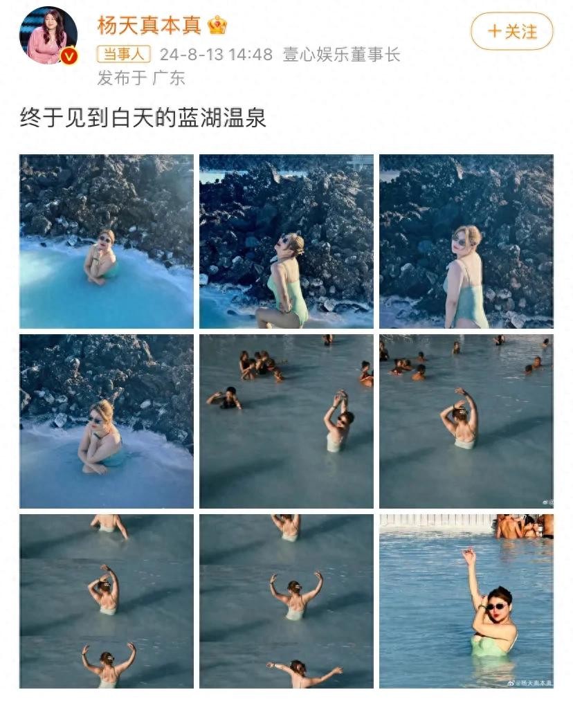 在照片中可以看到杨天真在一群外国人中白的发光,她在温泉中摆出各种姿势,想象着自己是一只美丽高贵典雅的白天鹅在舞蹈。