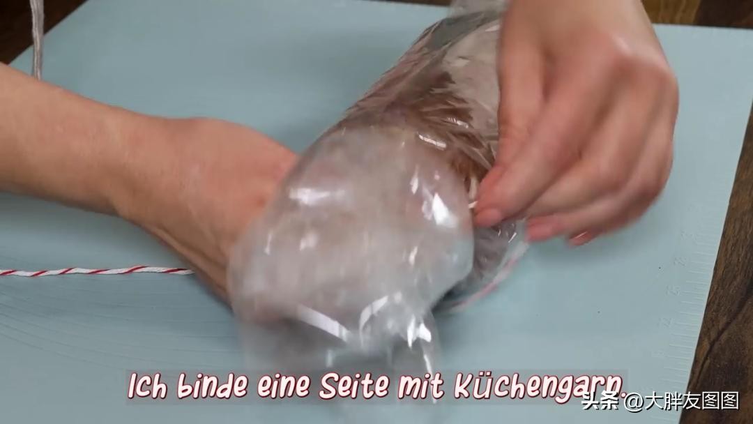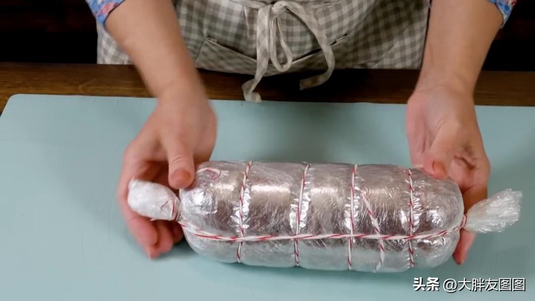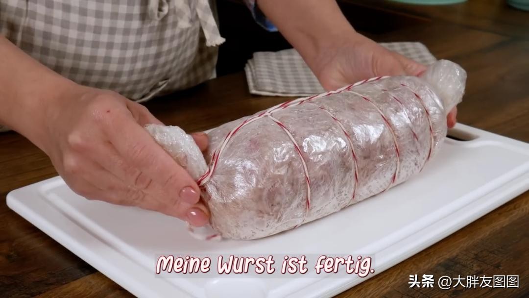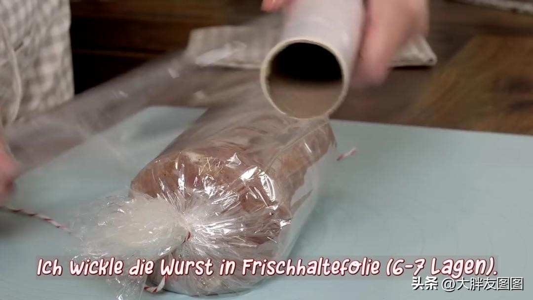 用保鲜膜(6-7 层)包裹香肠。用麻绳把香肠绑起来。扎紧。