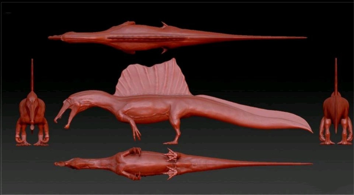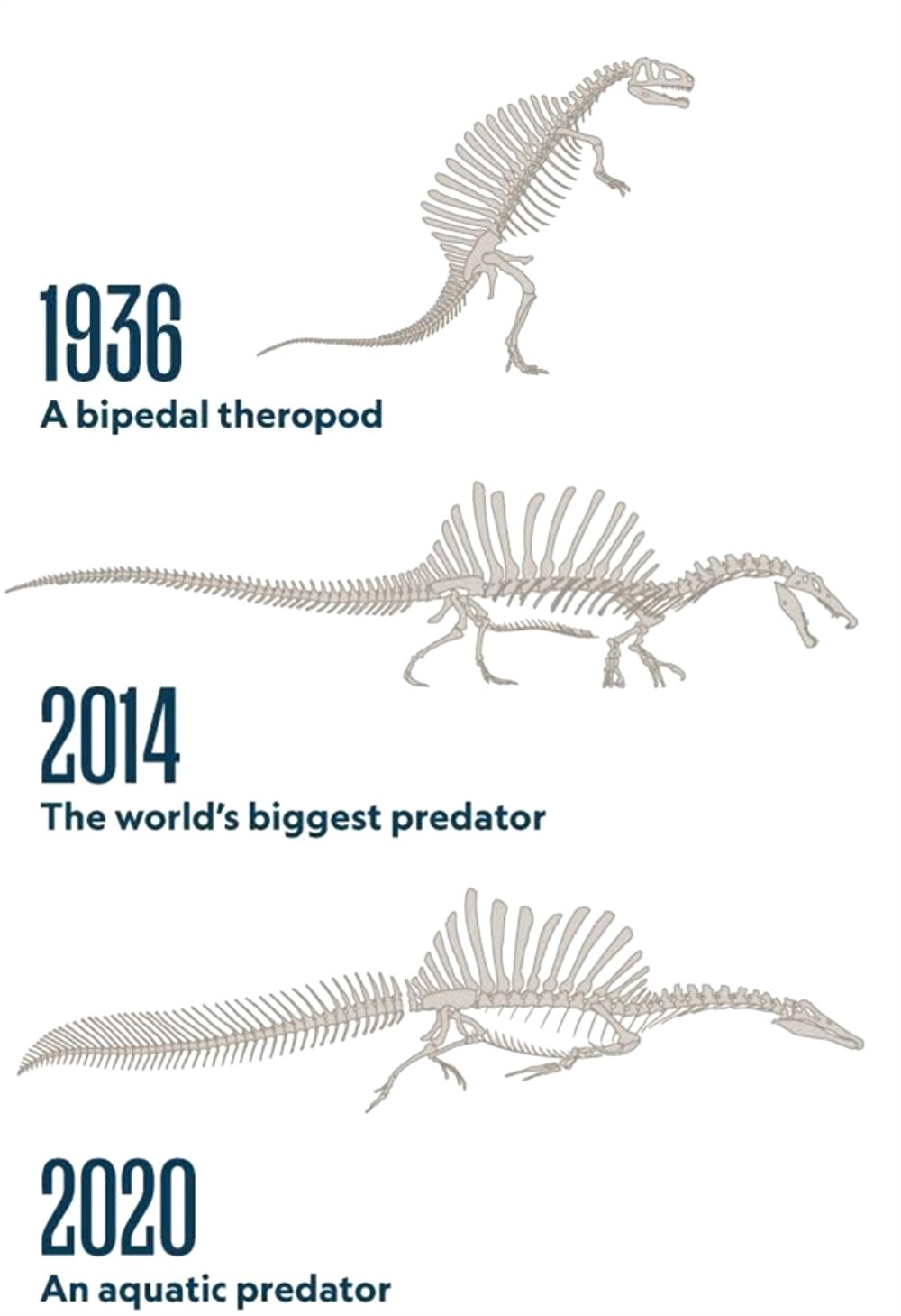 棘龙复原造型大概经历了初代棘龙、战神棘龙、四足棘龙和现在的“鳄鱼”棘龙四个阶段,下面这个图形象又生动地说明了这种变化: