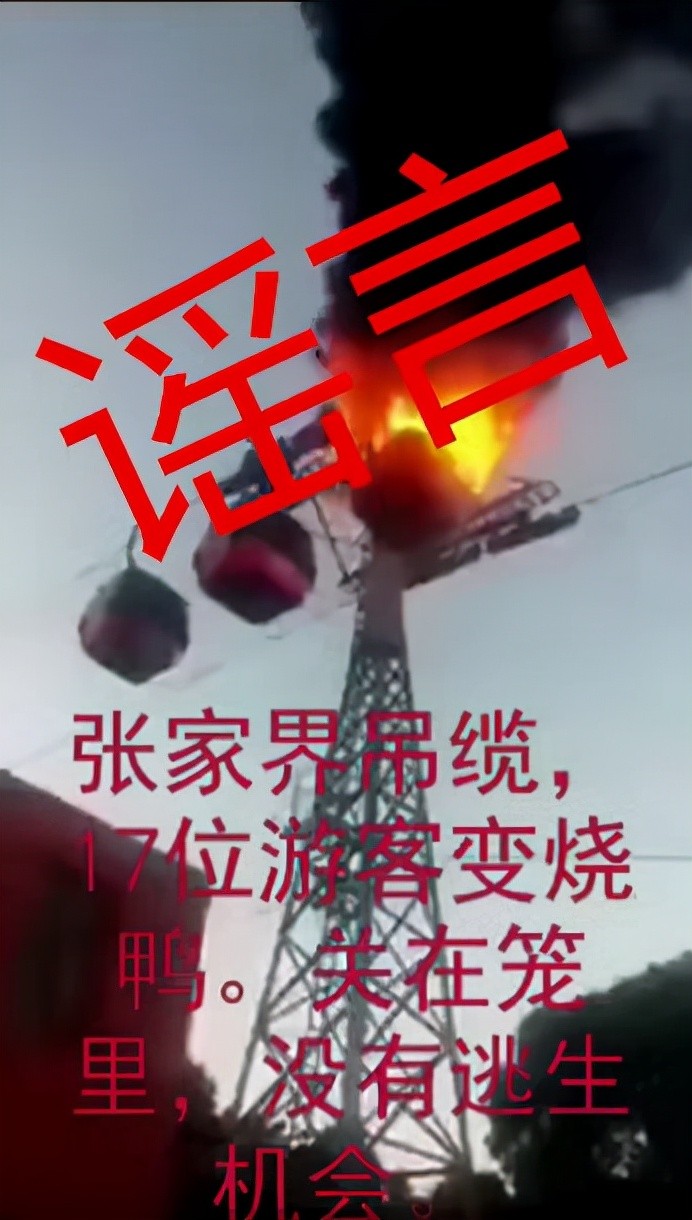 【网警辟谣】张家界缆车起火,17位游客变烧鸭?系谣言!