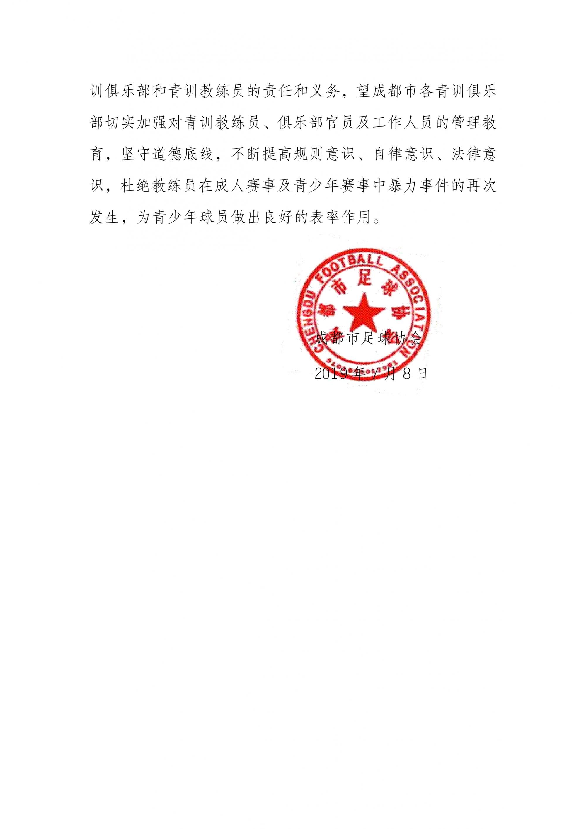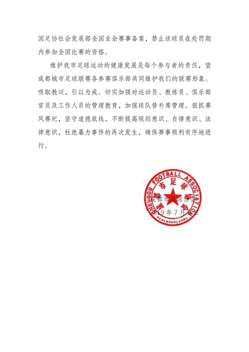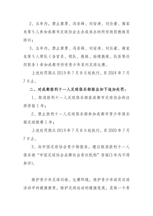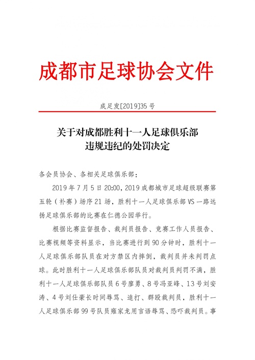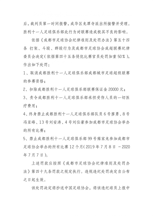 然而,在7月5日晚进行的成超联赛中,因对当值主裁判判罚不满,成都胜利十一人足球俱乐部个别球员对主裁拳脚相加。经鉴定,此次暴力行为造成主裁判多处软组织损伤,施暴行为极其恶劣,社会影响极其严重。
