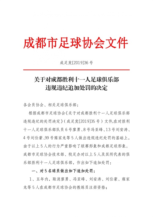 成都全搜索新闻网(记者 但唐文)7月8日报道近日,成都城市足球超级联赛赛场惊现球员群殴裁判的暴力行为,造成裁判身体多处受伤(新闻回顾<<<)。7月8日,成都市公安局成华区分局向成都市足协通报,对涉事人员依法处以行政拘留10日并处500元罚款。同日,成都市足协也公布处罚结果:取消成都胜利十一人足球俱乐部成都城市足球超级联赛的参赛资格,终身禁止6号廖勇、8号冯亚峰、13号刘安涛、4号刘仕豪参加成都市足协举办的所有比赛。