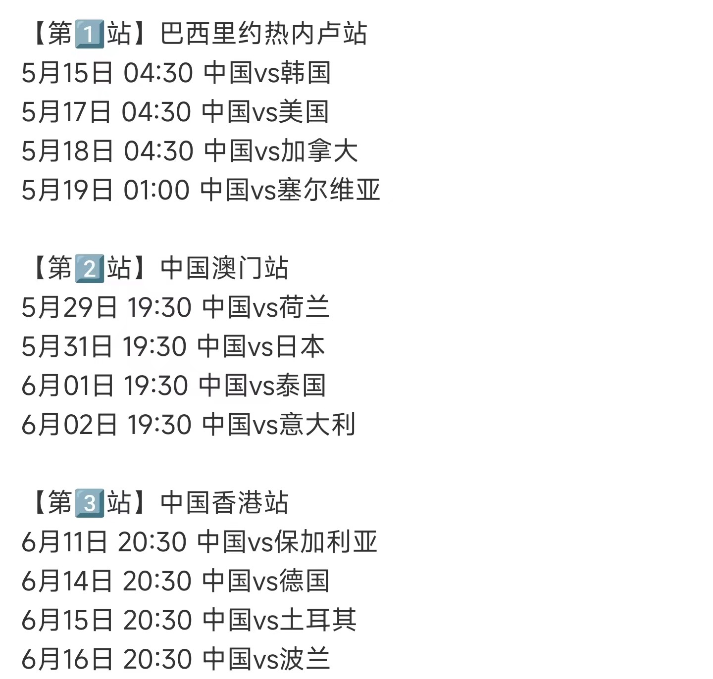 中国女排最新赛程出炉!2024年5月先后开启巴西、澳门、香港3站赛