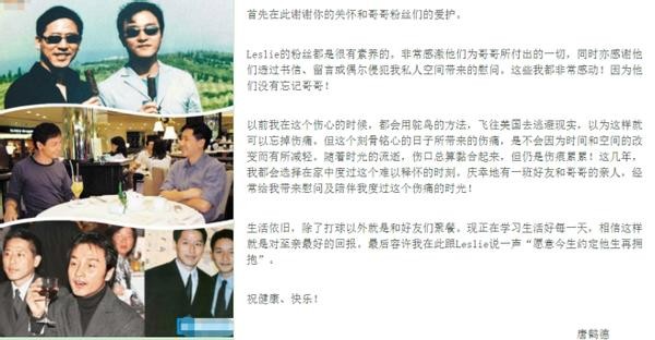 唐鹤德在张国荣逝世之后一直低调安静地生活着,在张国荣逝世十周年时,唐鹤德还曝光了几张和张国荣的珍贵合影,并且在报刊上发布了一封信,从信中可以看出,唐鹤德在以往伤心的时候,会飞往国外逃避现实,但伤痛并不会因为时间和空间的改变而有所减轻,依旧伤痕累累,一字一句都透露着他的悲伤。