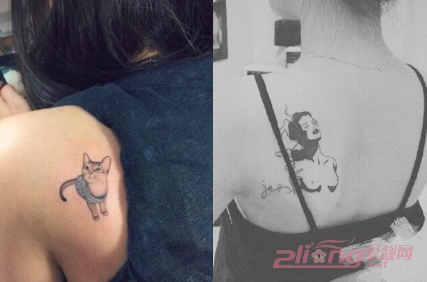 【女生后背纹身图03】如果你是个爱宠物的女生,不妨可以尝试将你家的猫咪或狗狗纹在后背的一侧上,色彩丰富的猫咪形象活灵活现,在一侧展现出不同一般的精致感,而人物的后背纹身也是相当地性感独特喔,逼真的人物画像总能令人喜爱不已,即使是黑色的色彩运用也是恰到好处喔!