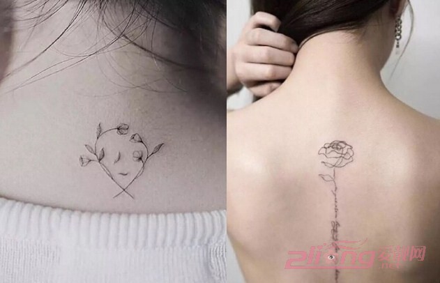 【女生后背纹身图01】简单素净的小花朵纹身图案,以精巧的手法描绘在后背的位置,不显眼的图案彰显着最简约的时尚风格,非常地小清新。同样是干净的纹身图案描绘,这款将玫瑰花的茎部也栩栩如生地展现出来,刚好的位置透露着隐隐约约的性感风情,大气又时尚。