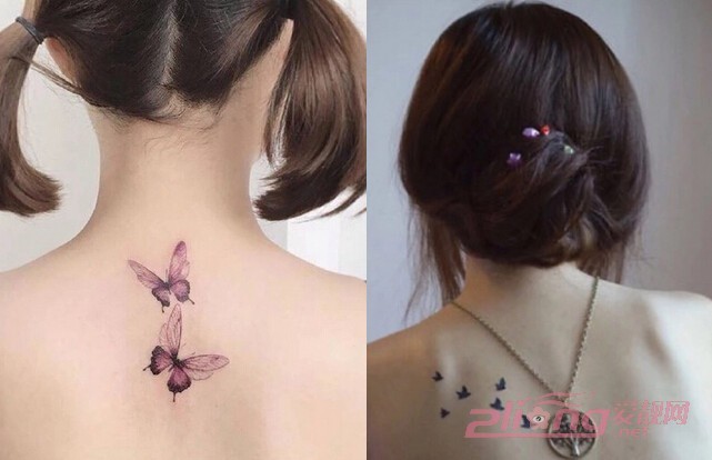 【女生后背纹身图05】紫色蝴蝶的相互伴随浪漫而唯美,在色彩的运用上摒弃了以往的普通颜色,用上了高贵紫的颜色让图案更加地好看灵动。简约的成群小鸟飞行的纹身图案更是随性的时尚感十足,不复杂的纹身效果往往就是极具魅力的流行表现喔!